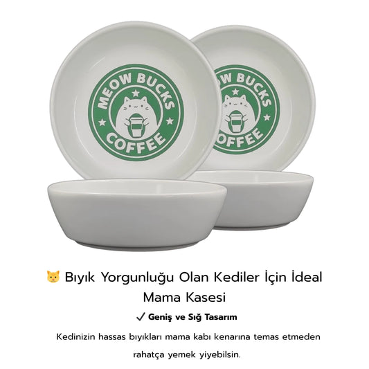 Seramik Kedi Mama ve Su Kabı | MEOW BUCKS COFFEE Baskılı | 2 ADET KASE