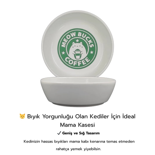 Seramik Kedi Mama ve Su Kabı | MEOW BUCKS COFFEE Baskılı | 1 ADET KASE