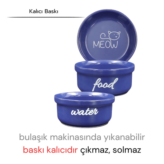 Seramik Kedi Mama ve Su Kabı | MEOW Water Food Baskılı 2 ADET Lacivert KASE