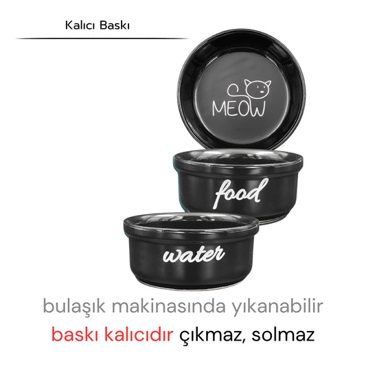 Seramik Kedi Mama ve Su Kabı | MEOW Water Food Baskılı 2 ADET Siyah KASE