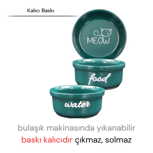 Seramik Kedi Mama ve Su Kabı | MEOW Water Food Baskılı 2 ADET Yeşil KASE