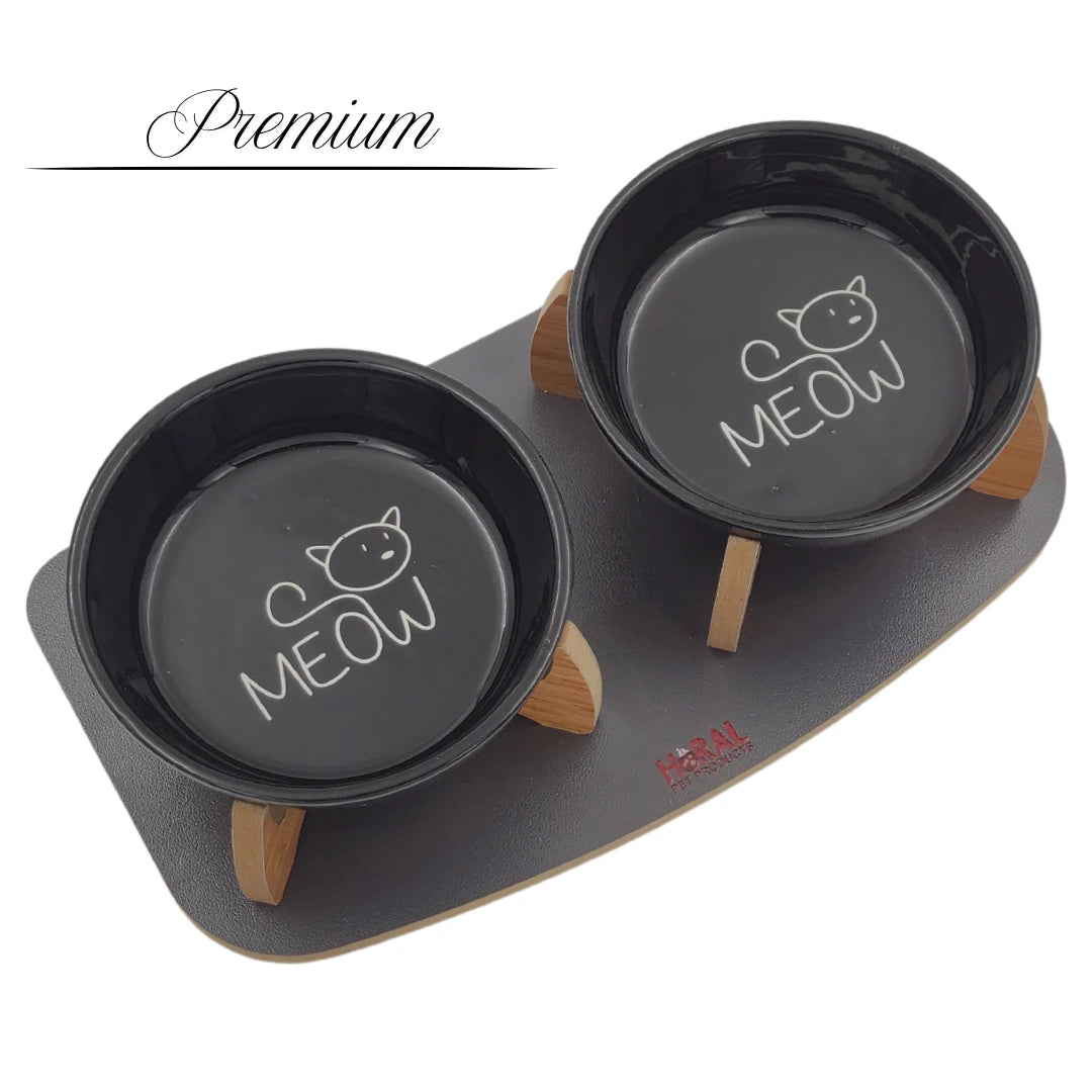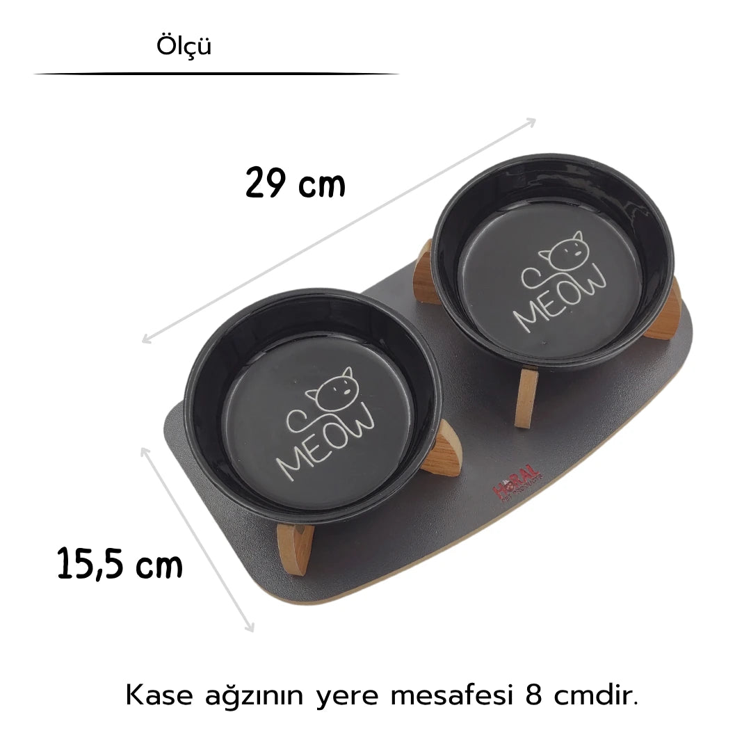 Kaydırmaz Tabanlı Seramik Kaseli Antrasit Ahşap Mama Ve Su Kabı – “MEOW” Siyah Baskılı Kaseler