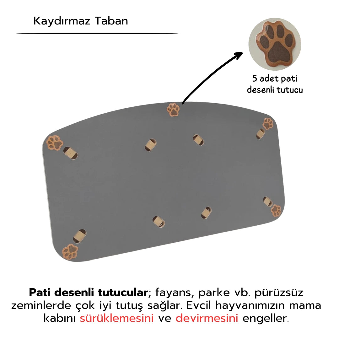✅ Kaydırmaz Taban: Ahşap tabanın altındaki 5 adet pati desenli tutucu sayesinde ürün, fayans ve parke gibi kaygan yüzeylerde bile sabit kalır. Kediniz mama yerken kabı kaydıramaz, deviremez.