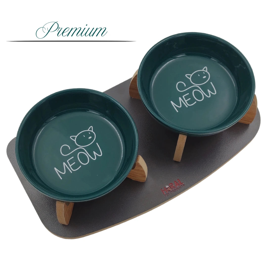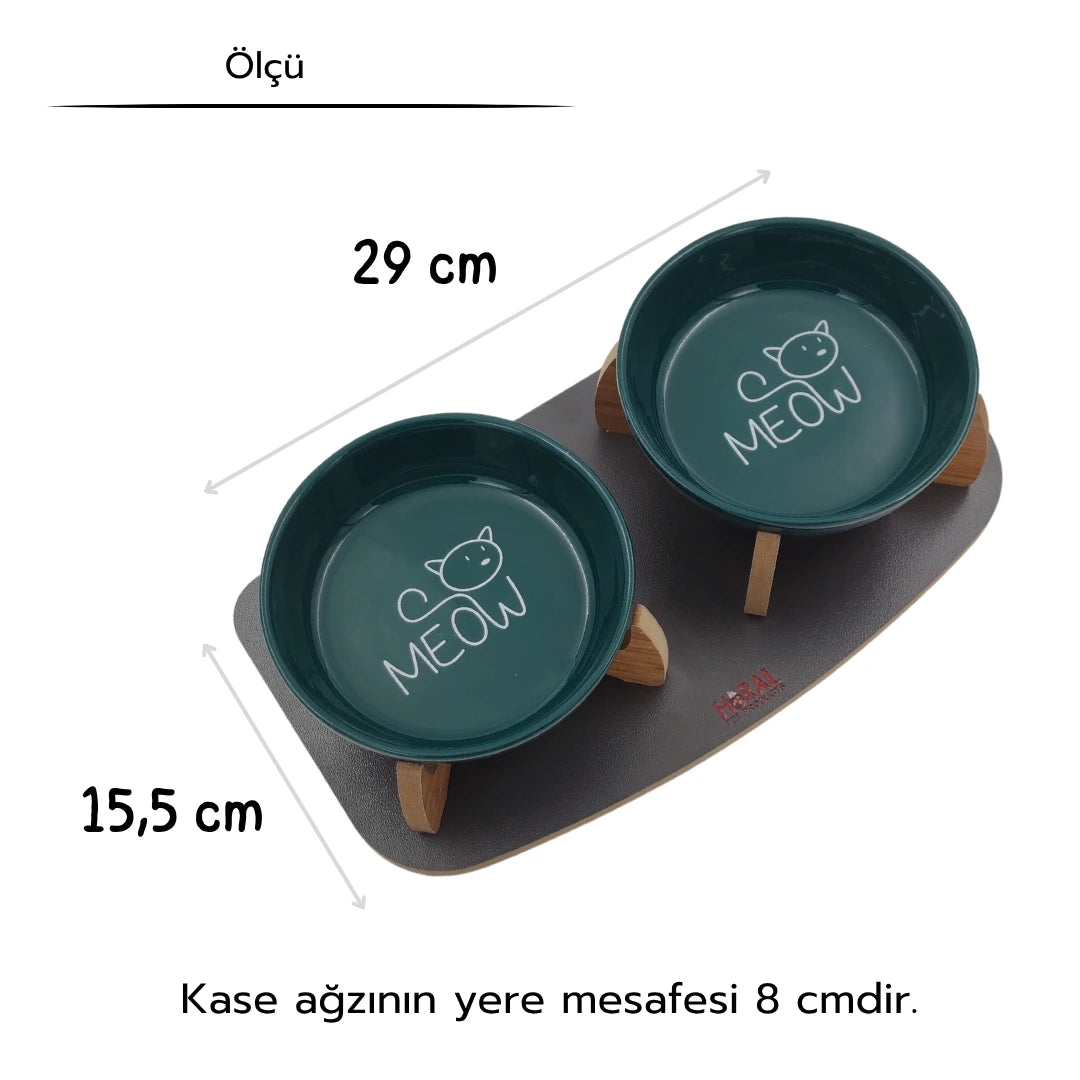 Kaydırmaz Tabanlı Seramik Kaseli Antrasit Ahşap Mama Ve Su Kabı – “MEOW” Yeşil Baskılı Kaseler