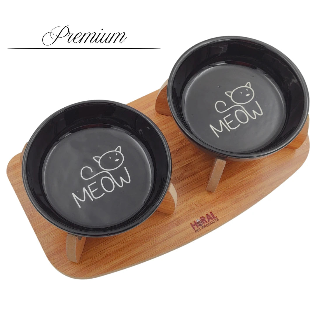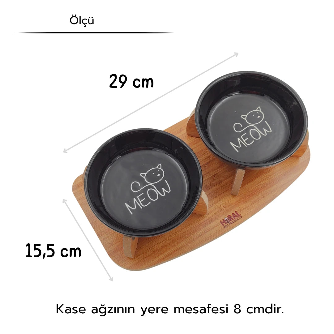 Kaydırmaz Tabanlı Seramik Kaseli Bambu Desen Ahşap Mama Ve Su Kabı – “MEOW” Siyah Baskılı Kaseler)