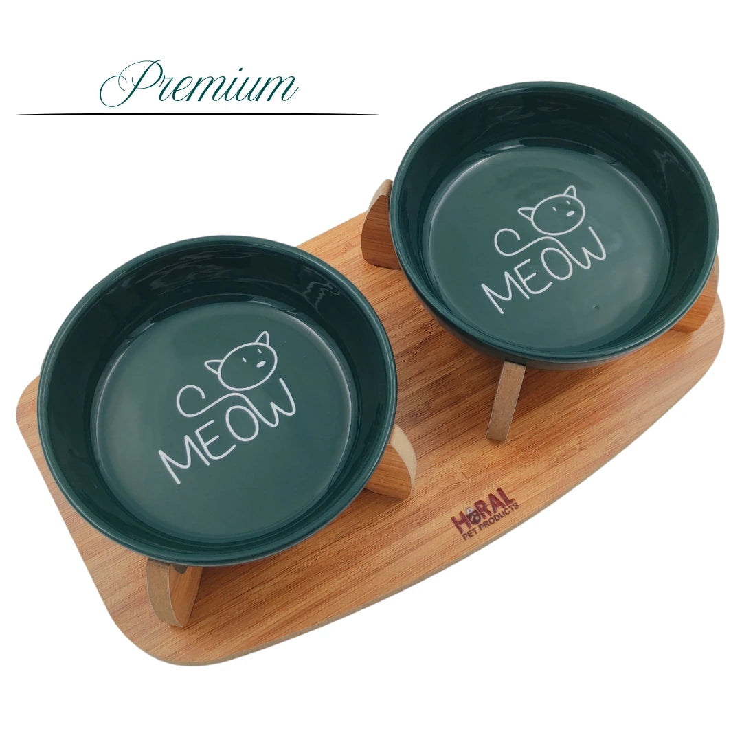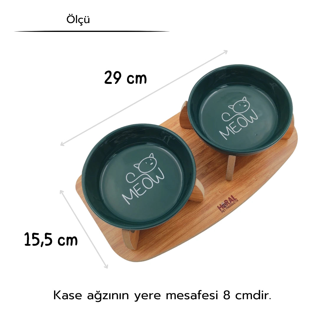 Kaydırmaz Tabanlı Seramik Kaseli Bambu Desen Ahşap Mama Ve Su Kabı – “MEOW” Yeşil Baskılı Kaseler
