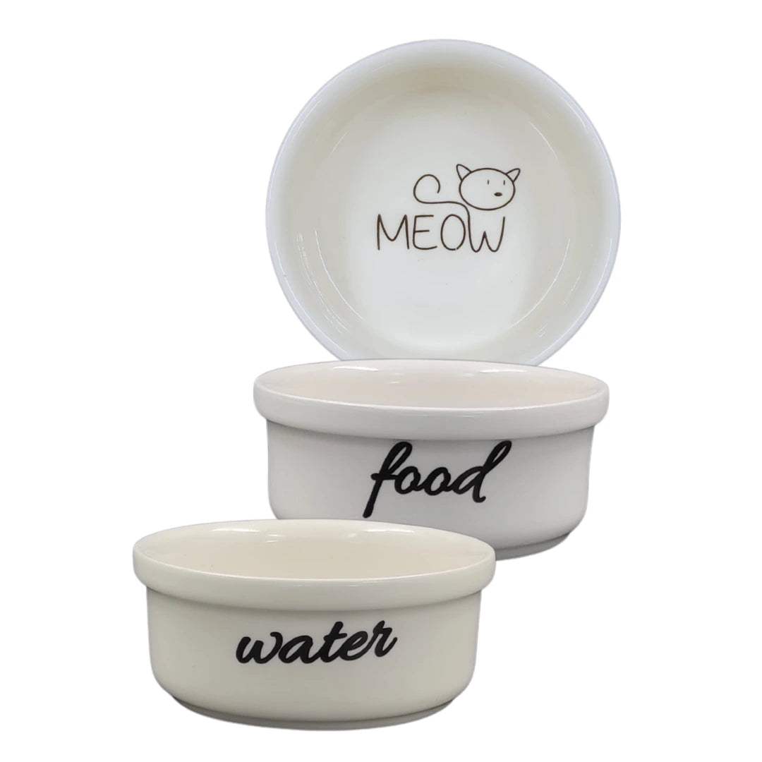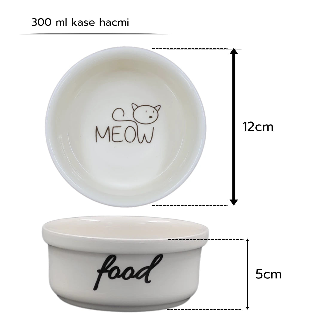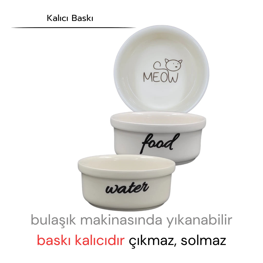 Seramik Kedi Mama ve Su Kabı | MEOW Water Food Baskılı 2 ADET Beyaz KASE