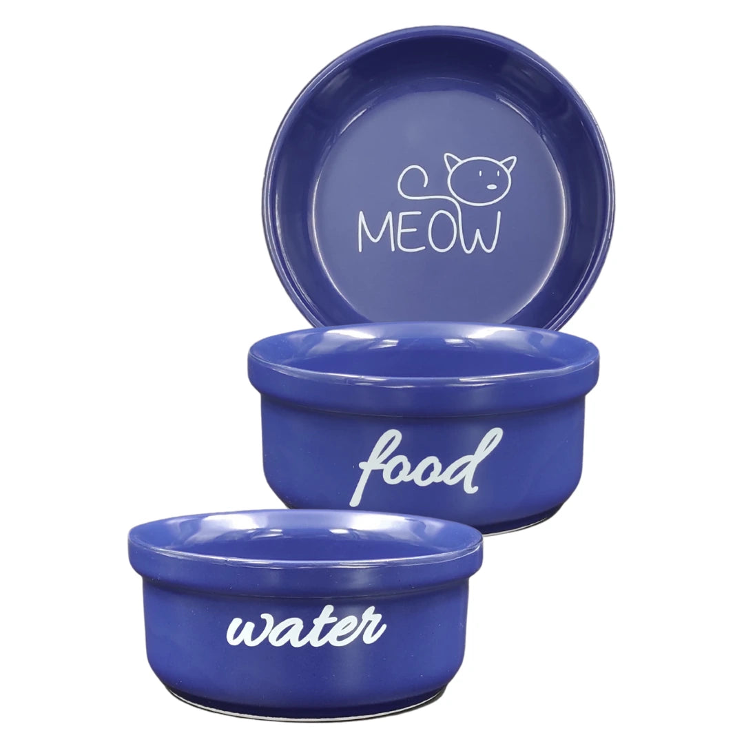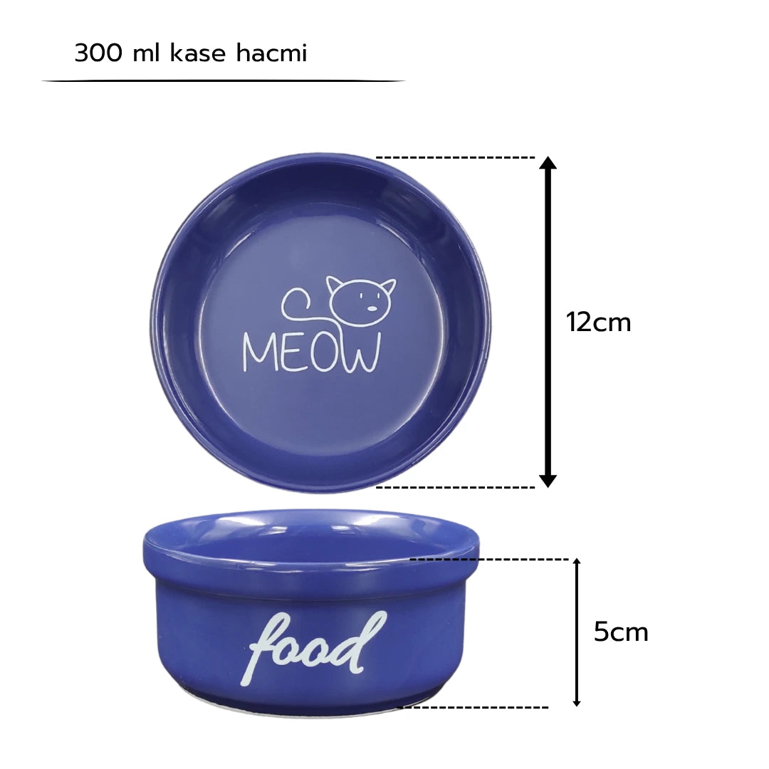 Seramik Kedi Mama ve Su Kabı | MEOW Water Food Baskılı 2 ADET Lacivert KASE