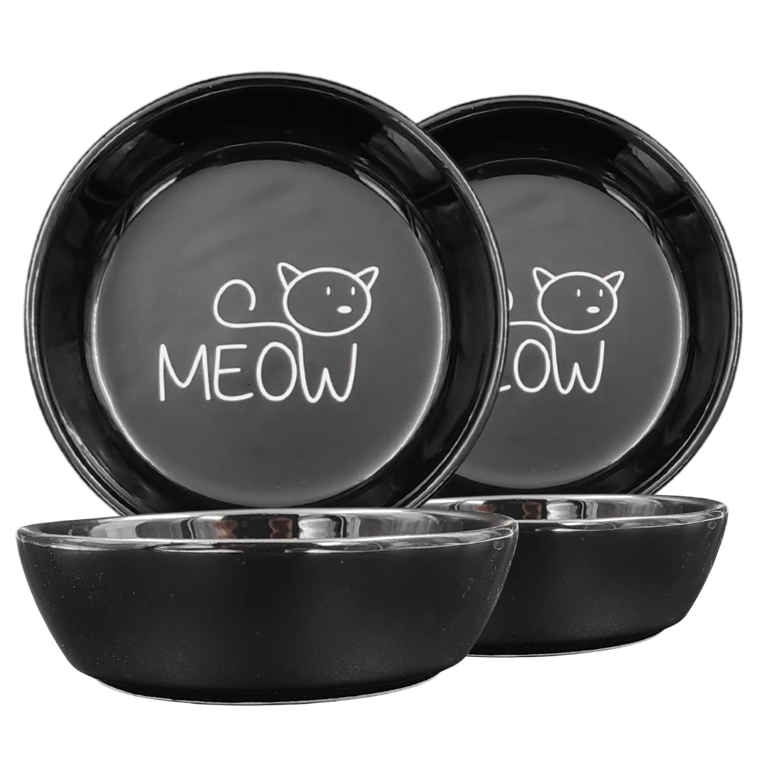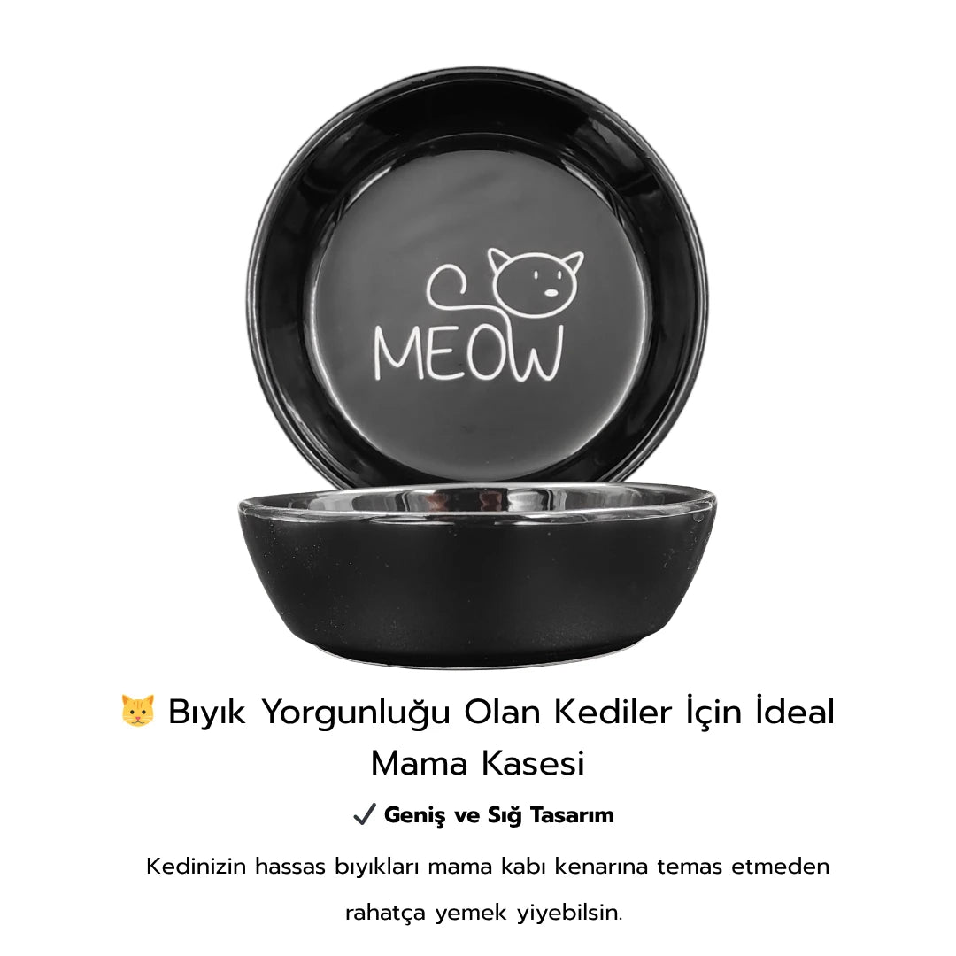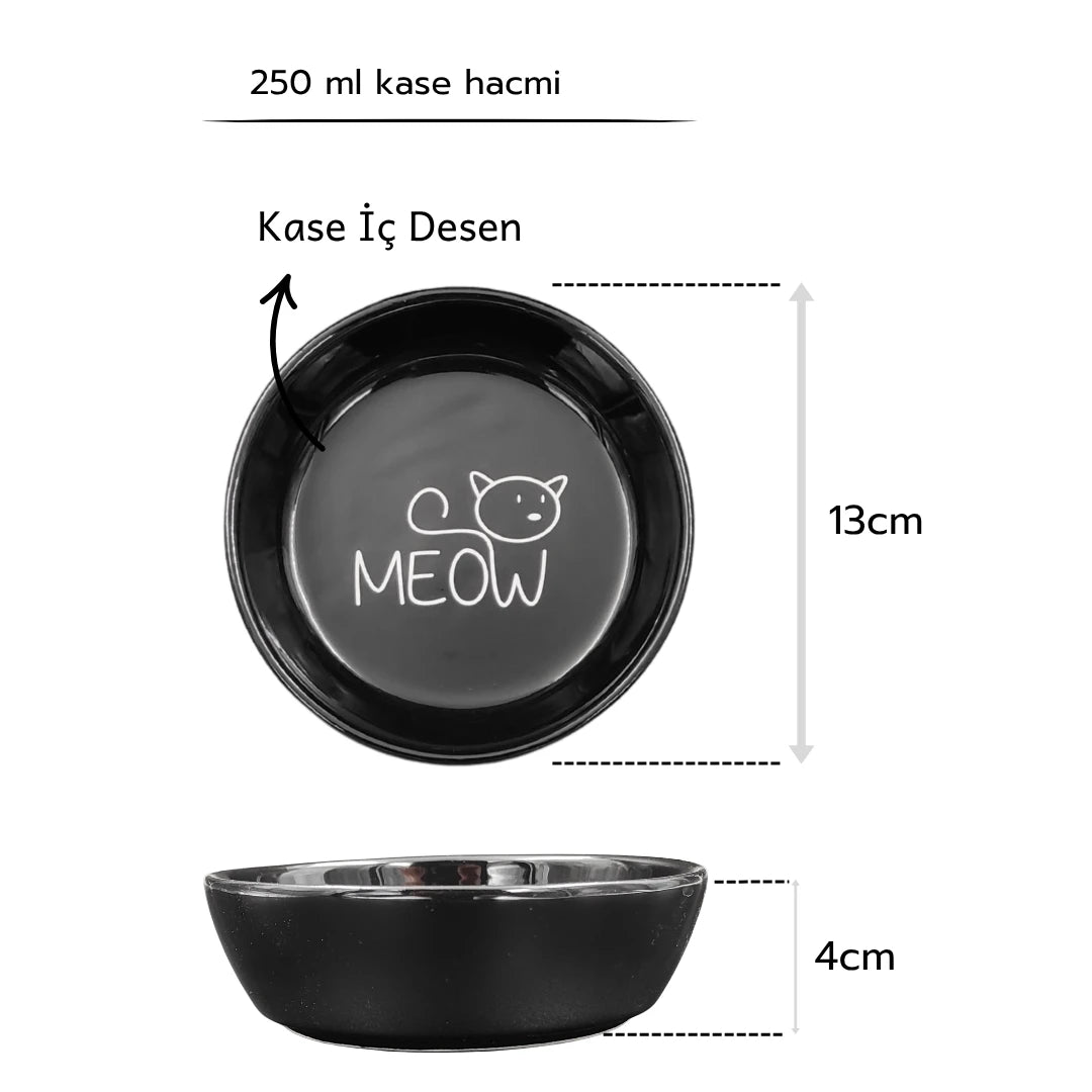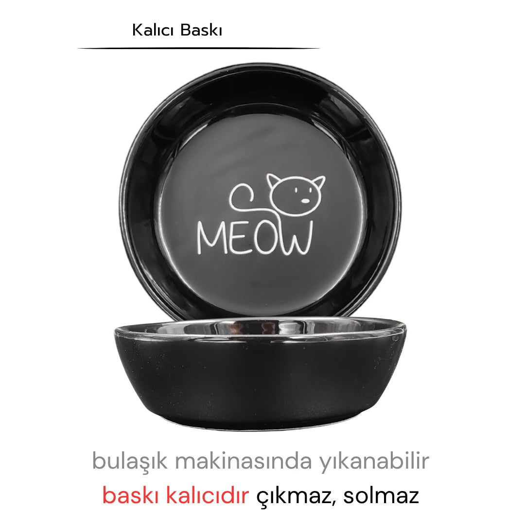 Seramik Kedi Mama ve Su Kabı | MEOW Baskılı 2 ADET Siyah KASE